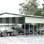This Clear Span Commercial Carport/Shed is 40′ wide, 30′ long and 12′ high with 2 vertical gables on both the ends, has enclosed sides with vertical paneling and 45 degree trim kits